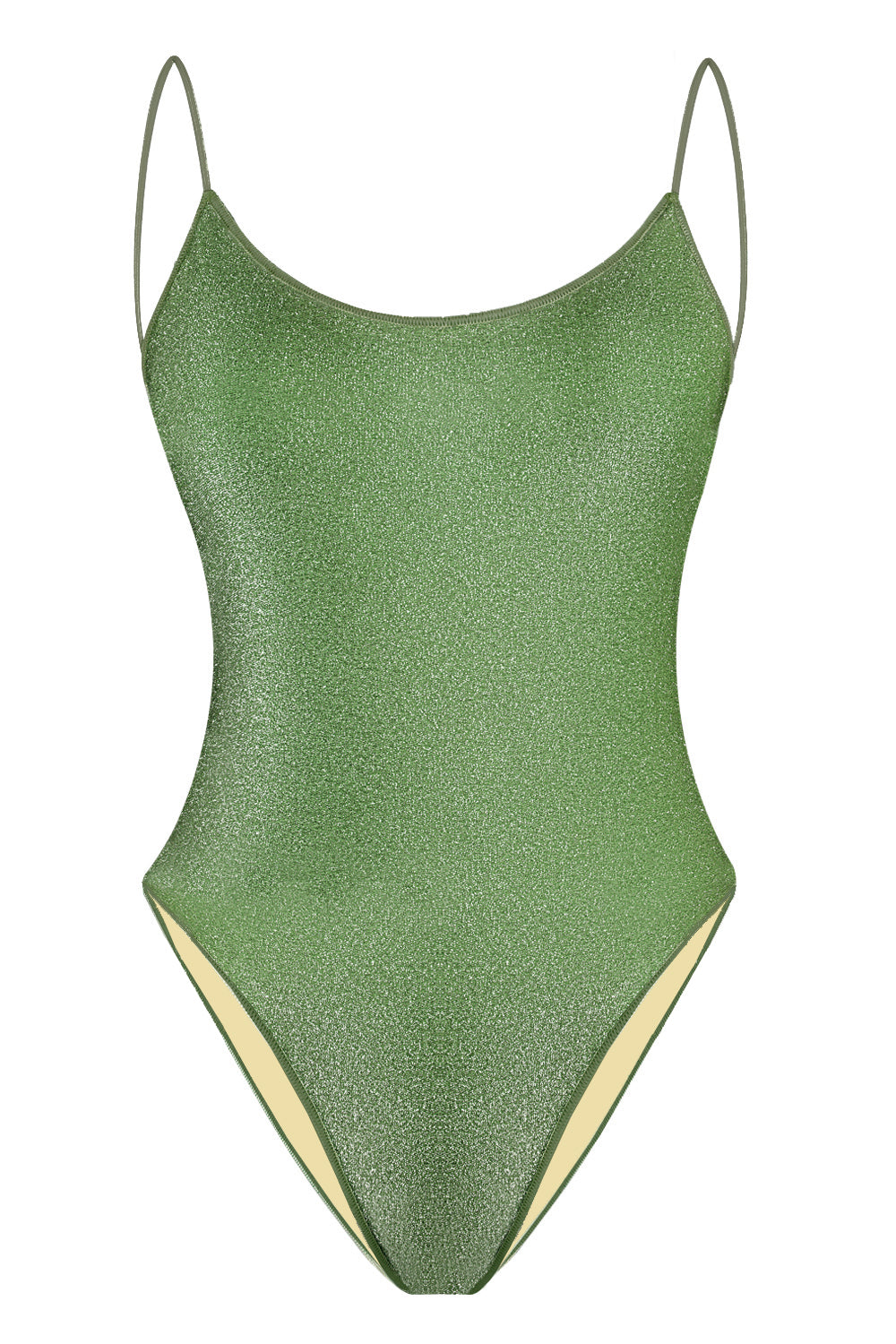 U yaka, ince askılı, sırt dekolteli, sim dokulu mayo