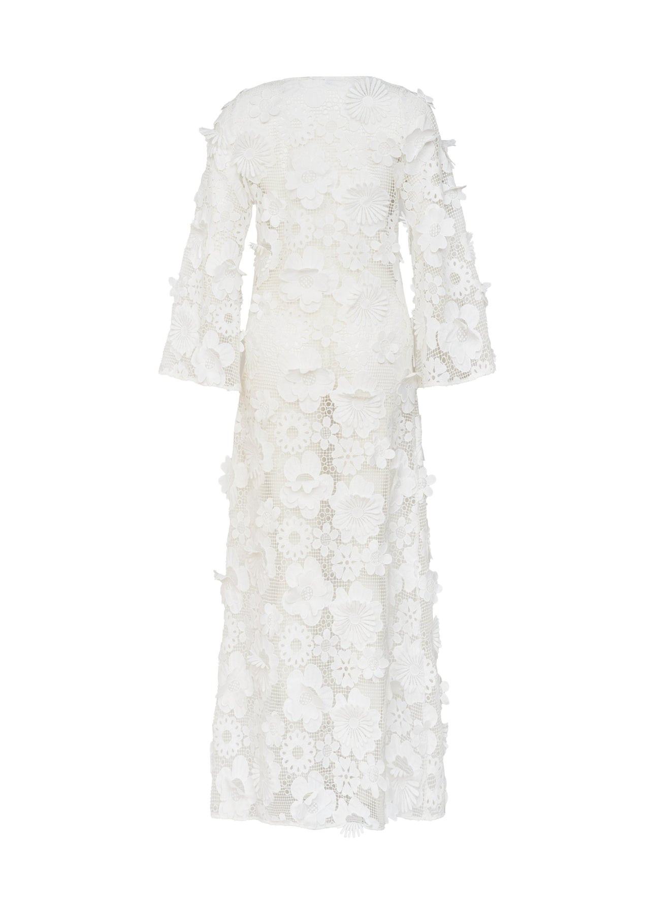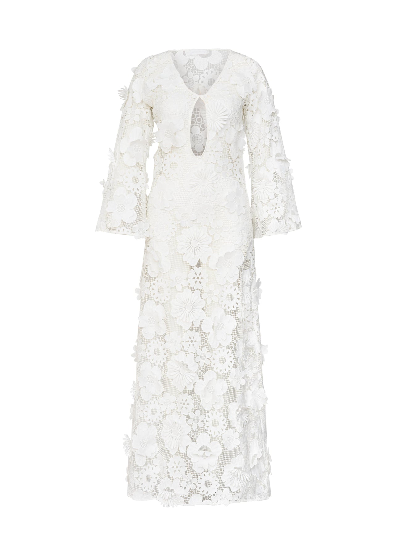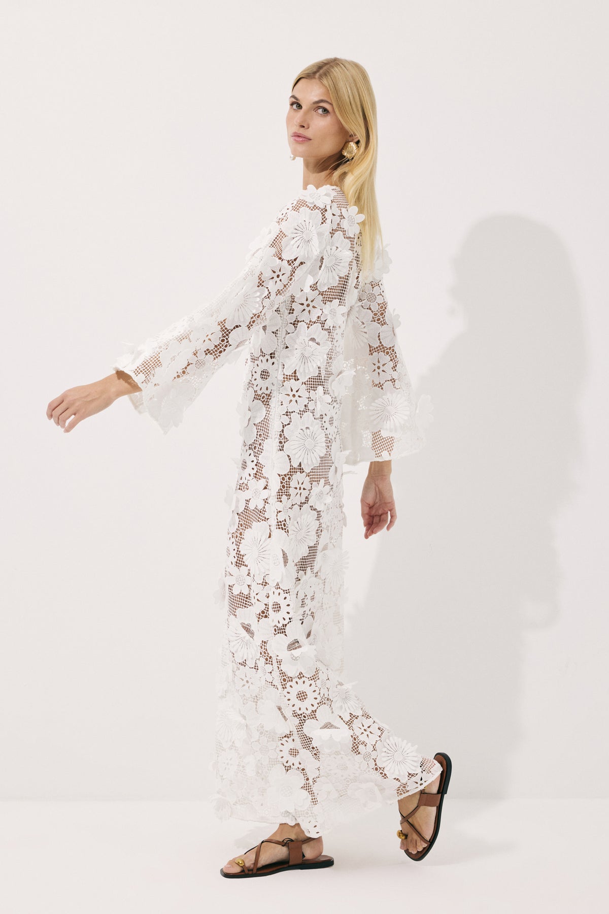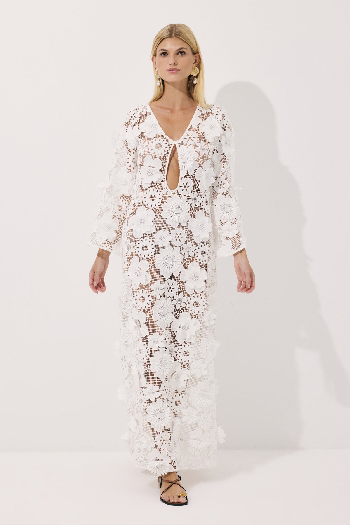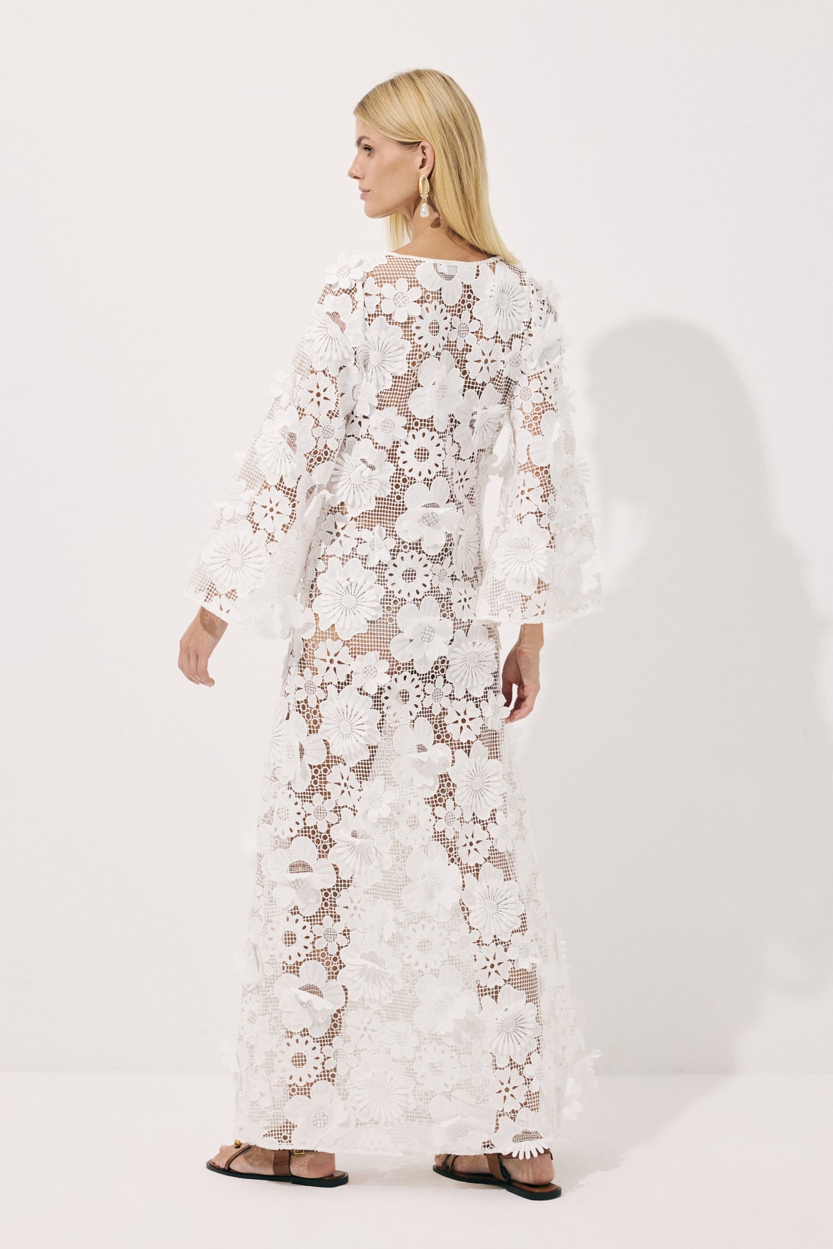 Çiçek Aplikeli Beyaz Kroşe Maxi Elbise