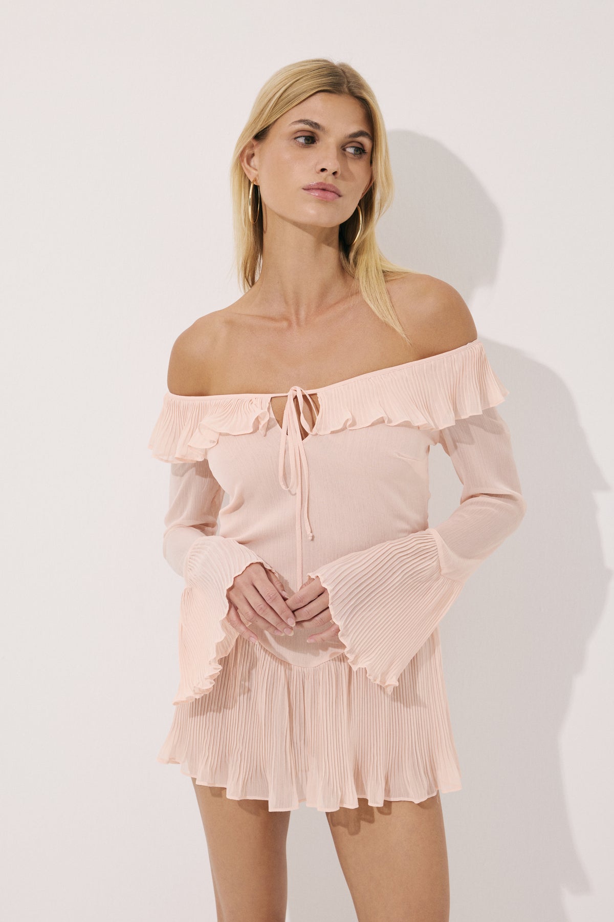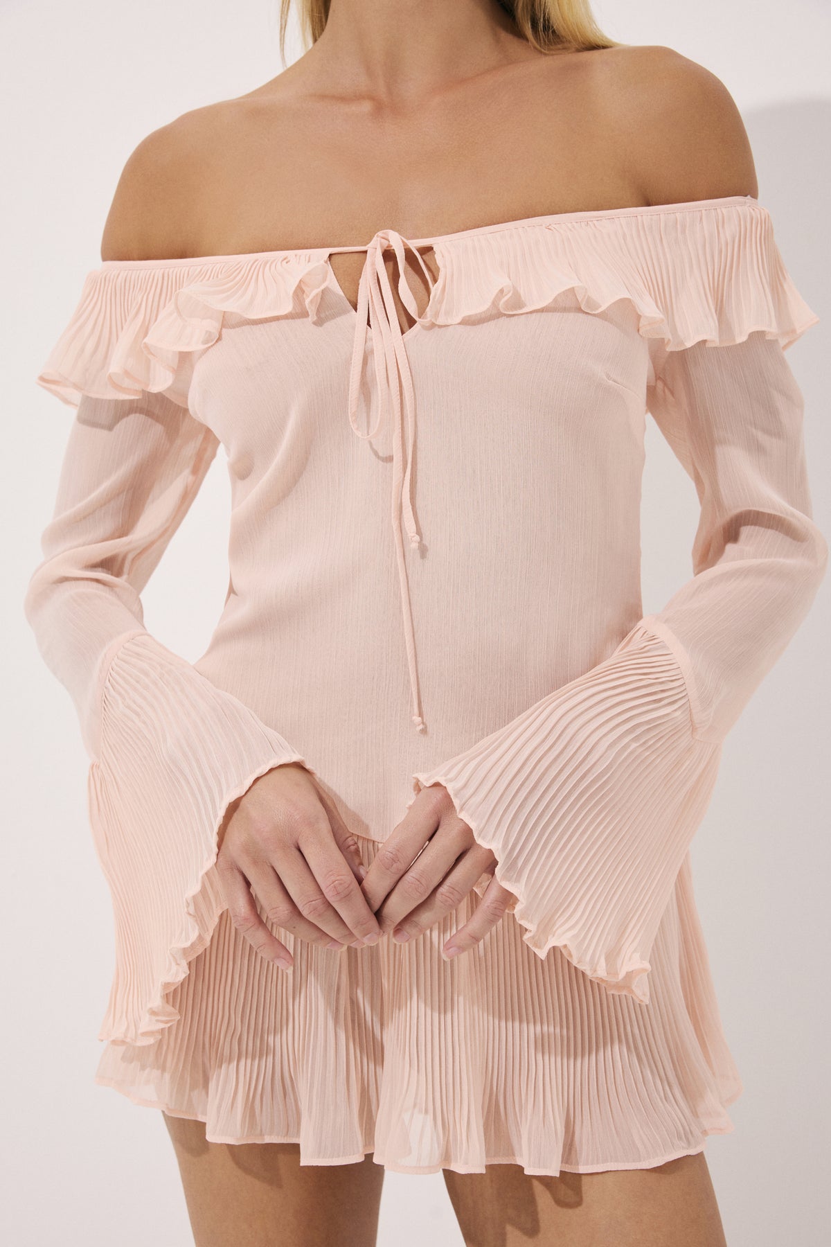 Hafif şifon kumaştan tasarlanan bu romantik mini elbise, zarif yavru ağzı tonu ile öne çıkar. Geniş fırfırlı yakası, kol, yaka ve etek ucundaki plise detayları ve göğüsteki zarif bağcık detayı ile feminen bir silüet sunar. Astarsız tasarımı hafiflik kazandırırken, sırttan gizli fermuarı şık bir bitiş sağlar.