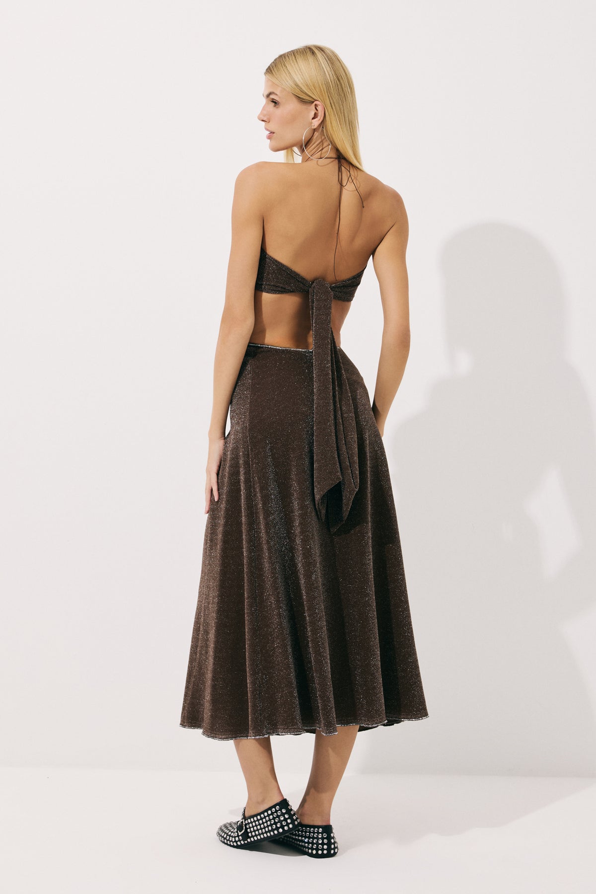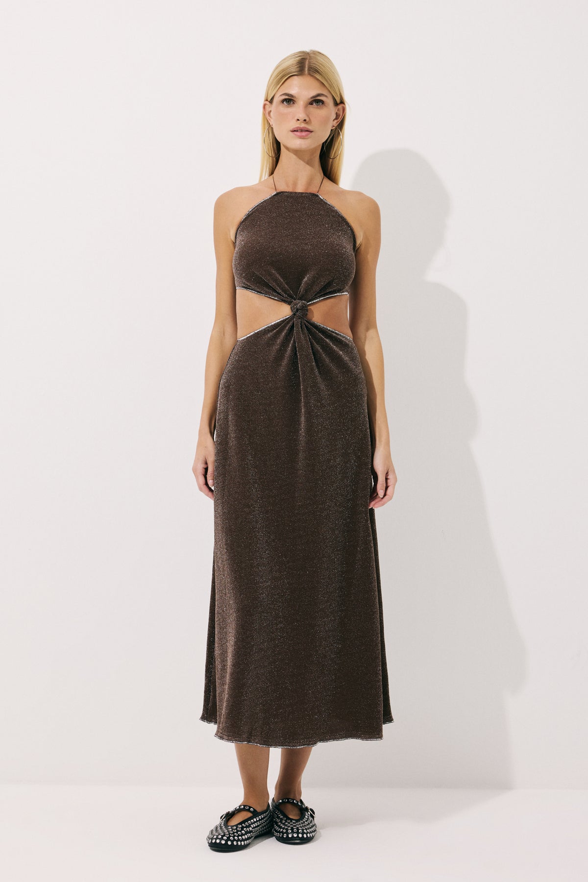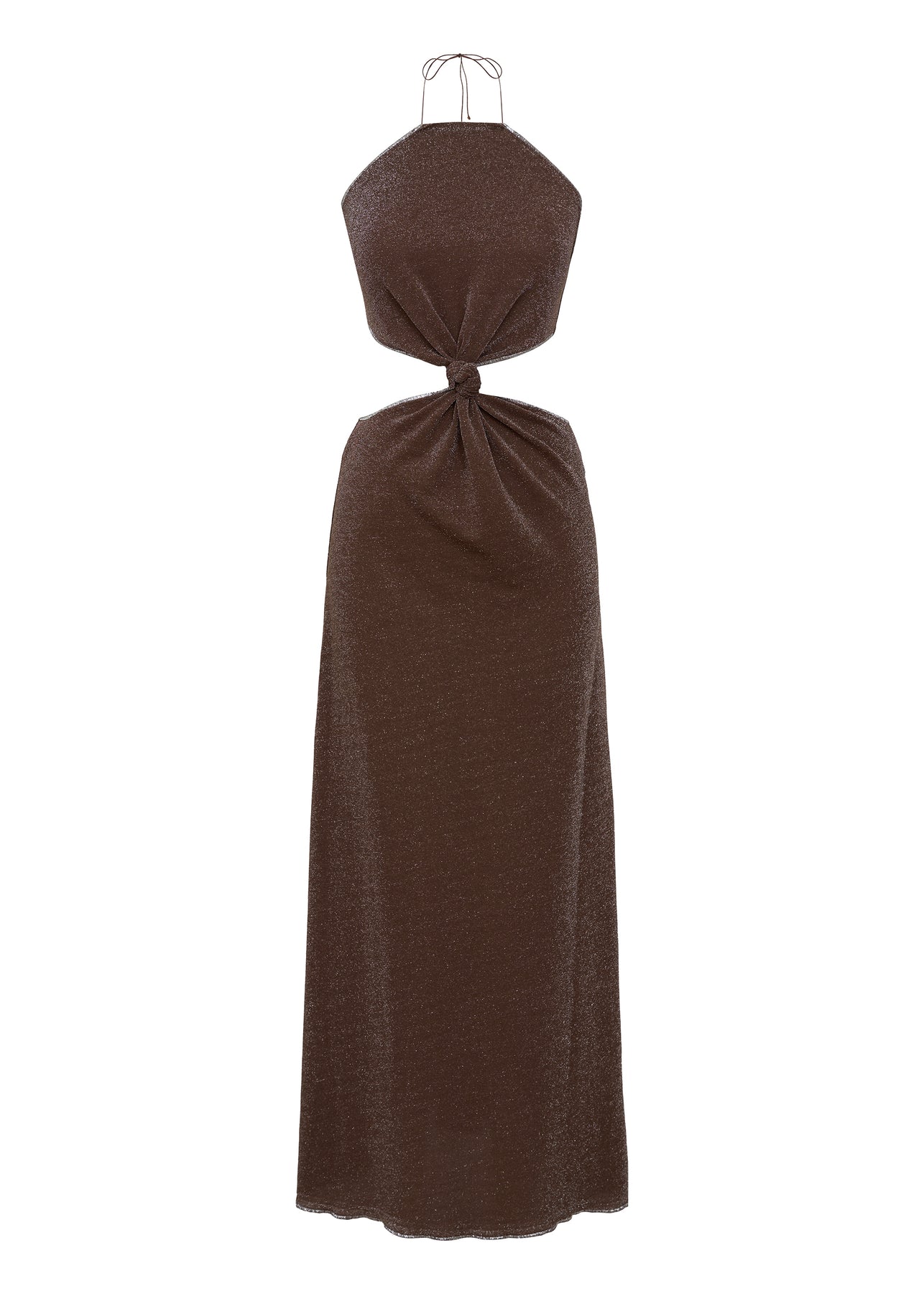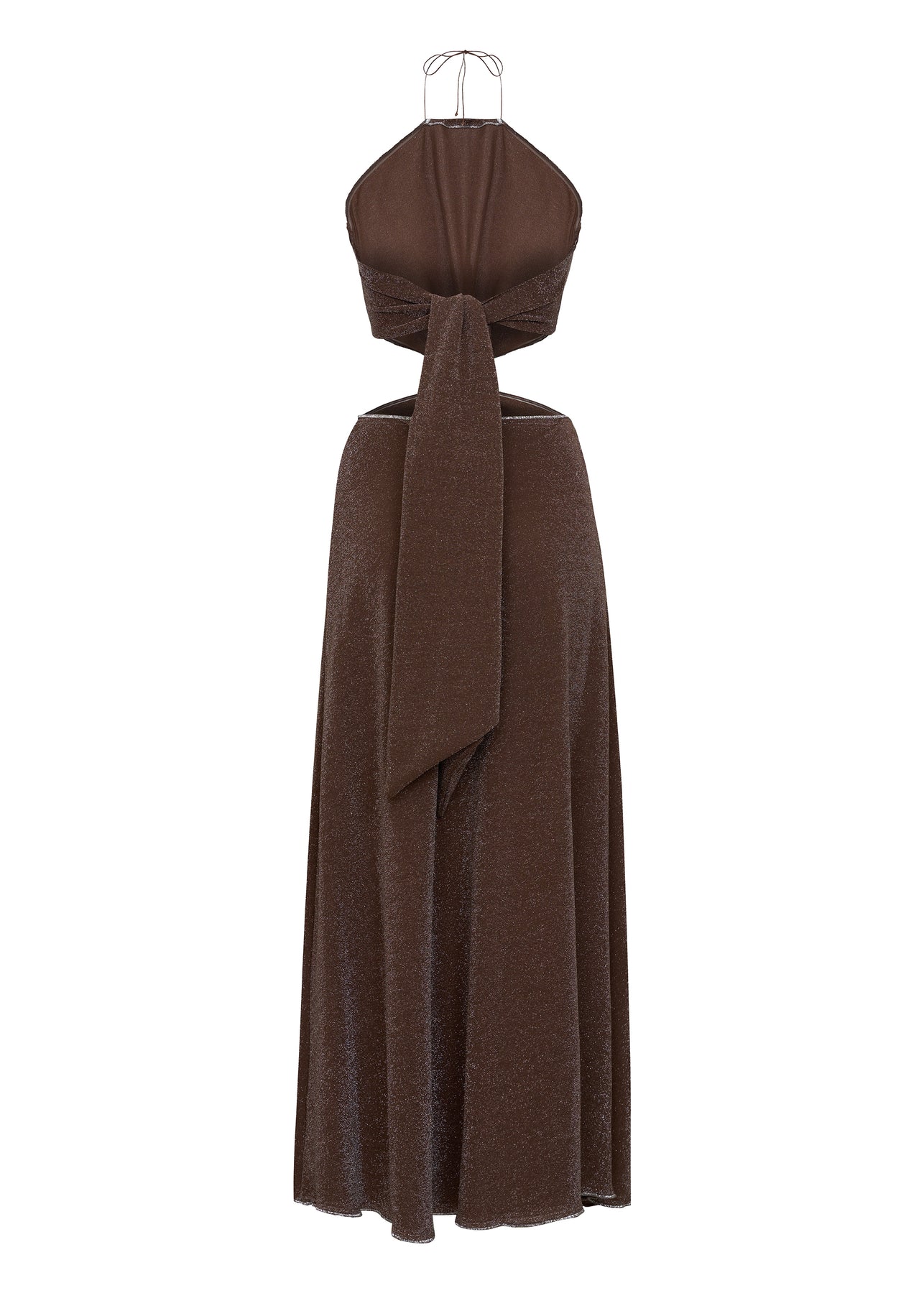 Düğümlü Boyundan Bağlamalı Simli Jarse Maxi Elbise