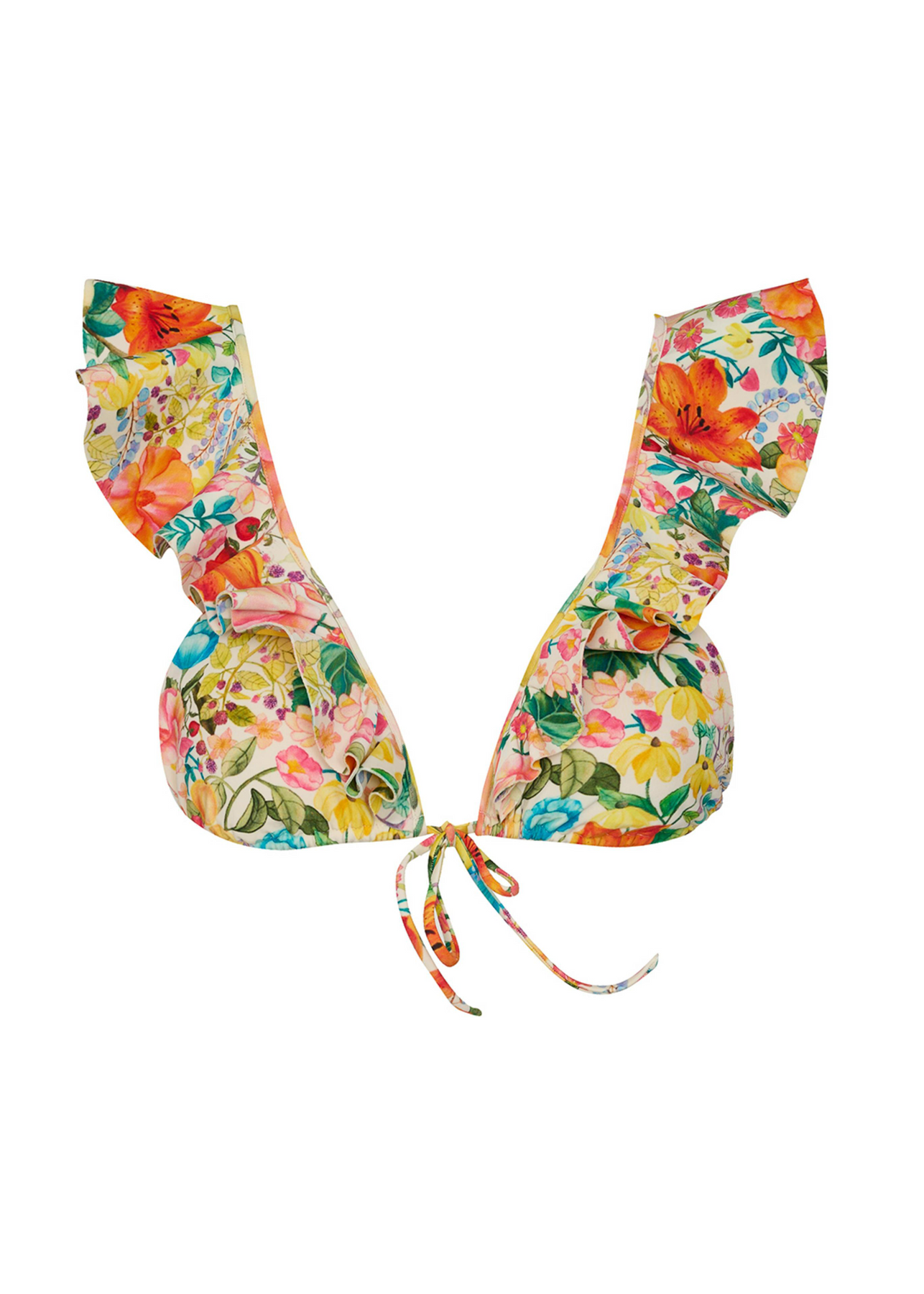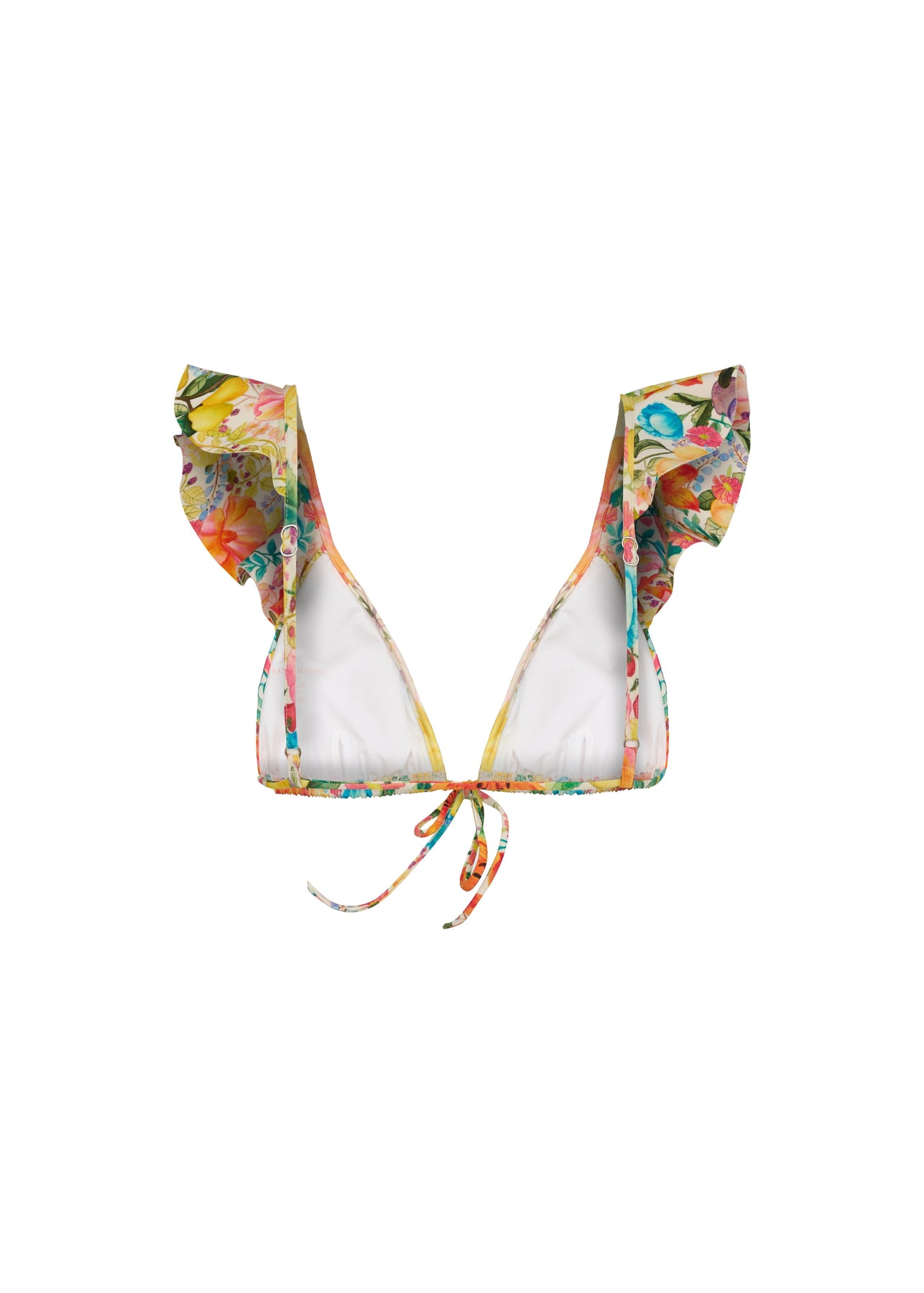 Zamansız üçgen bikiniyi lüks bir dokunuşla yeniden keşfedin. İnce fırfır detaylı omuzları ve dikkat çekici desenli kumaşıyla modern zarafeti feminen bir çekicilikle buluşturan bu parça, yaz gardırobunuzun vazgeçilmezi olacak.