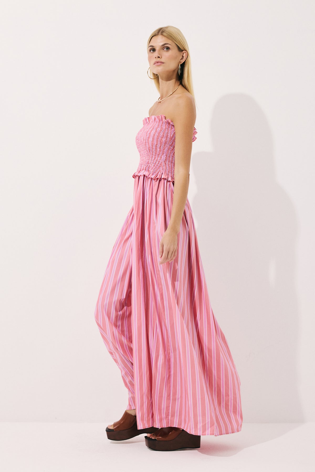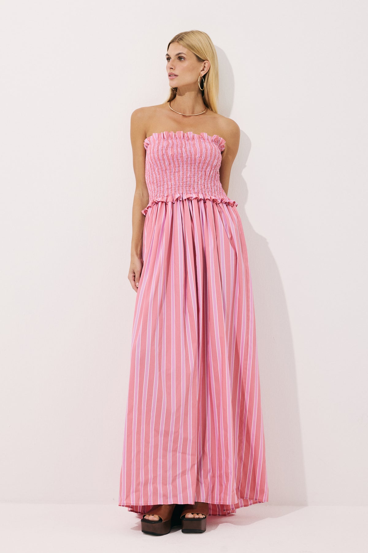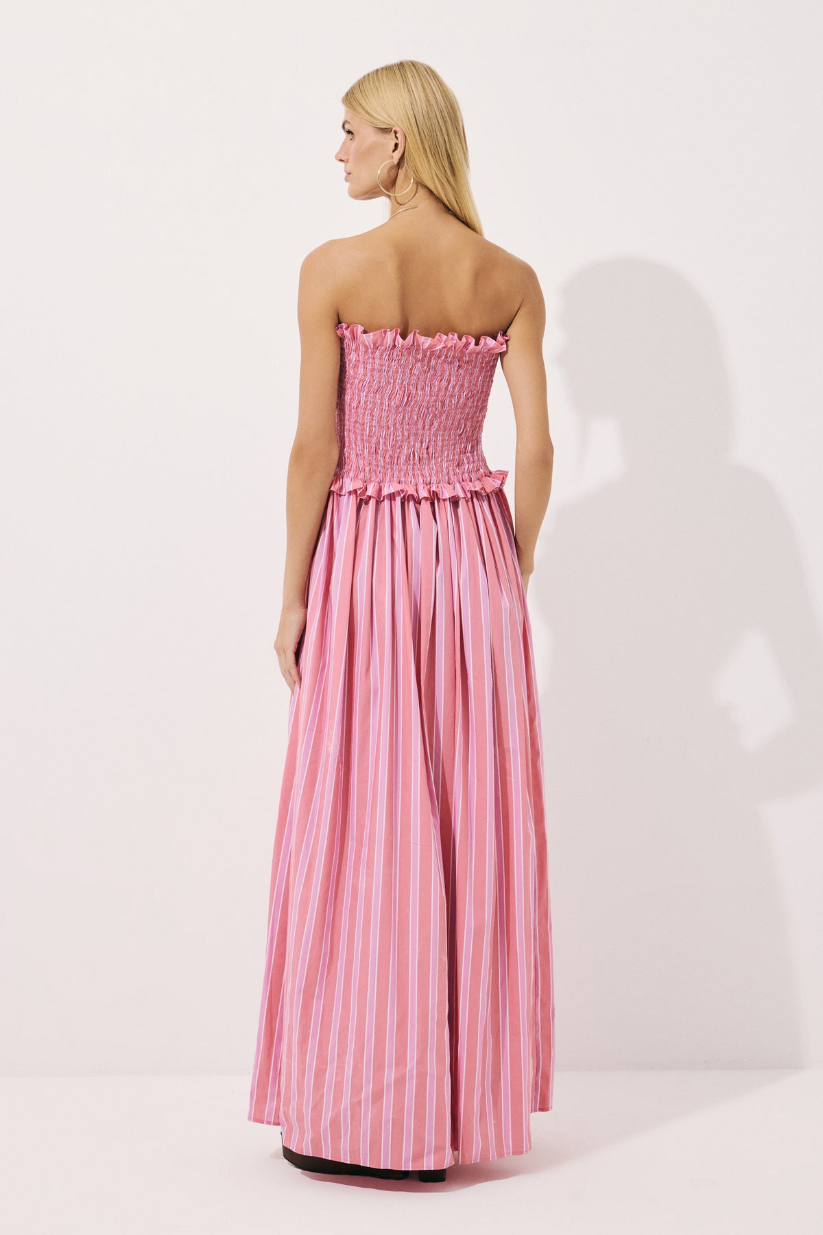 Yumuşak pamuk karışımlı kumaştan tasarlanan maxi elbise, feminen silüeti zarif gipeli detayıyla vurgular. Çizgili dokusu zamansız bir şıklık sunarken, hem sahil görünümleri hem de yaz akşamları için ideal bir parça haline gelir.