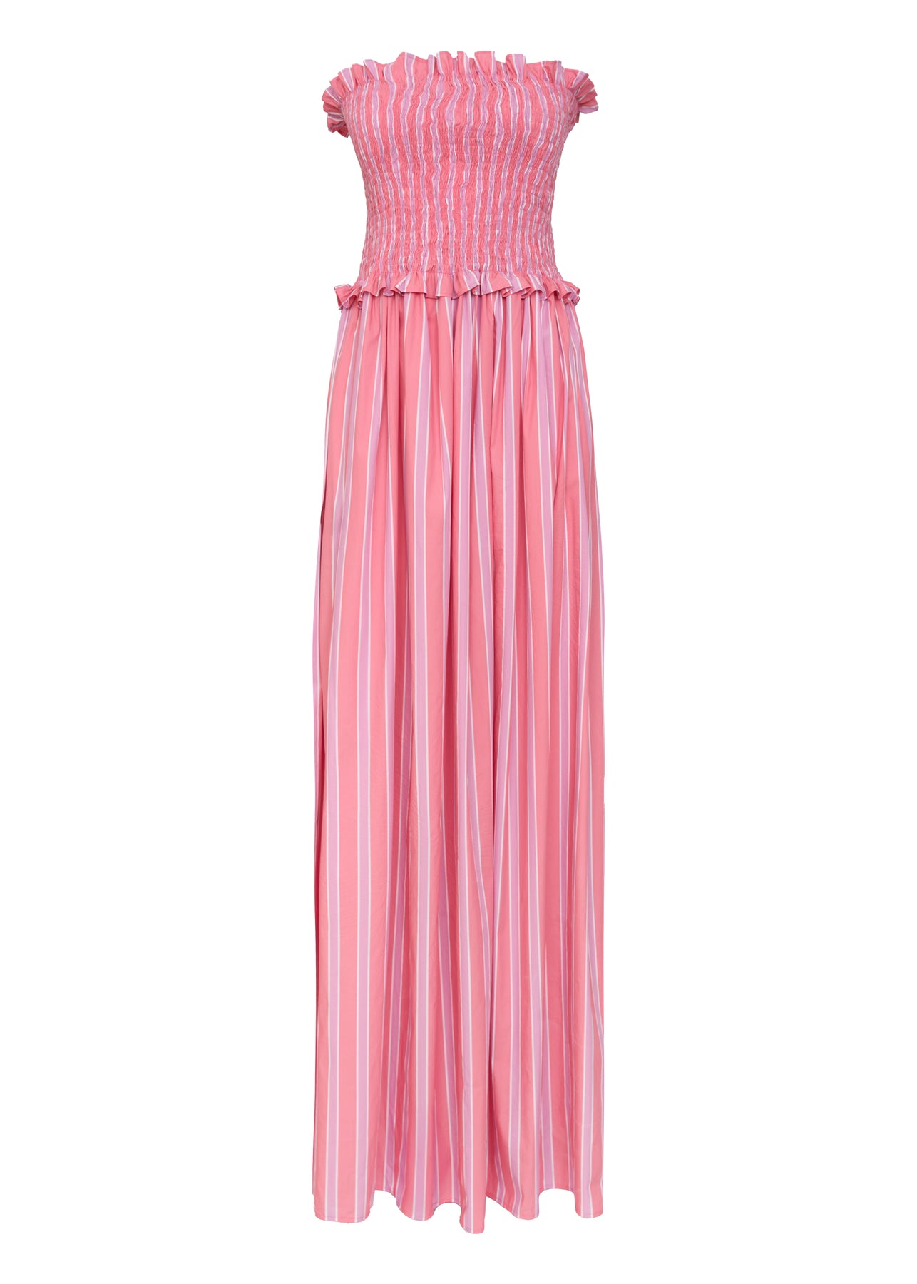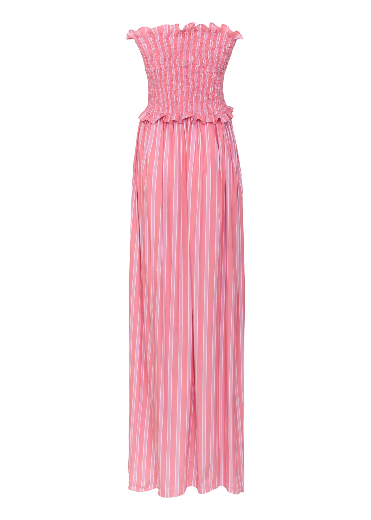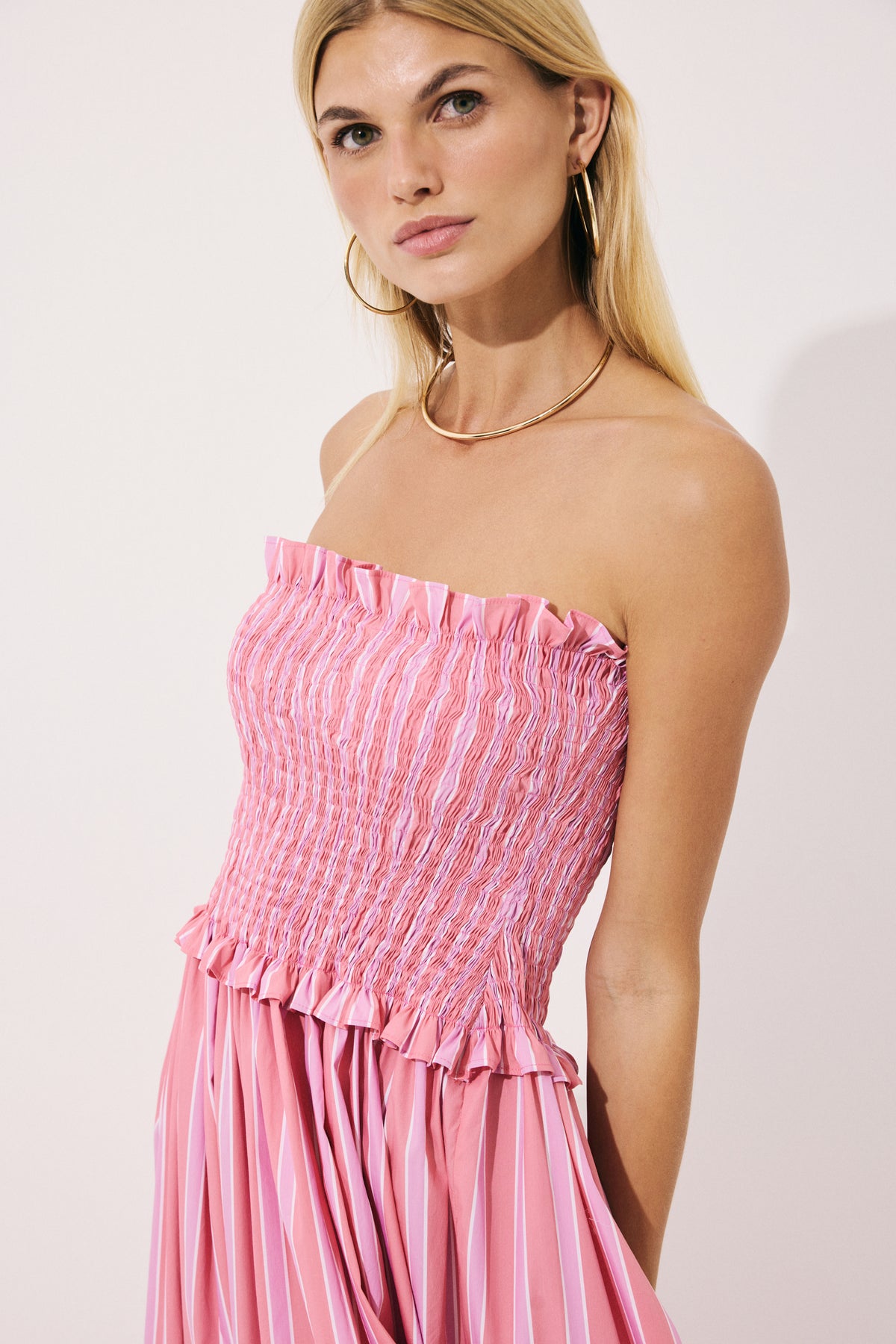 Yumuşak pamuk karışımlı kumaştan tasarlanan maxi elbise, feminen silüeti zarif gipeli detayıyla vurgular. Çizgili dokusu zamansız bir şıklık sunarken, hem sahil görünümleri hem de yaz akşamları için ideal bir parça haline gelir.